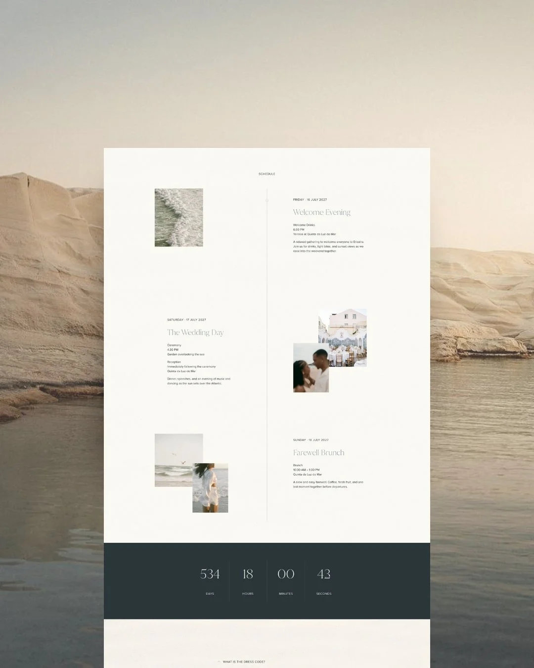 At a destination wedding, guests are committing to more than one day. Your website should clearly outline the scope of the celebration from the start, whether it’s a weekend-long gathering or a multi-day itinerary.