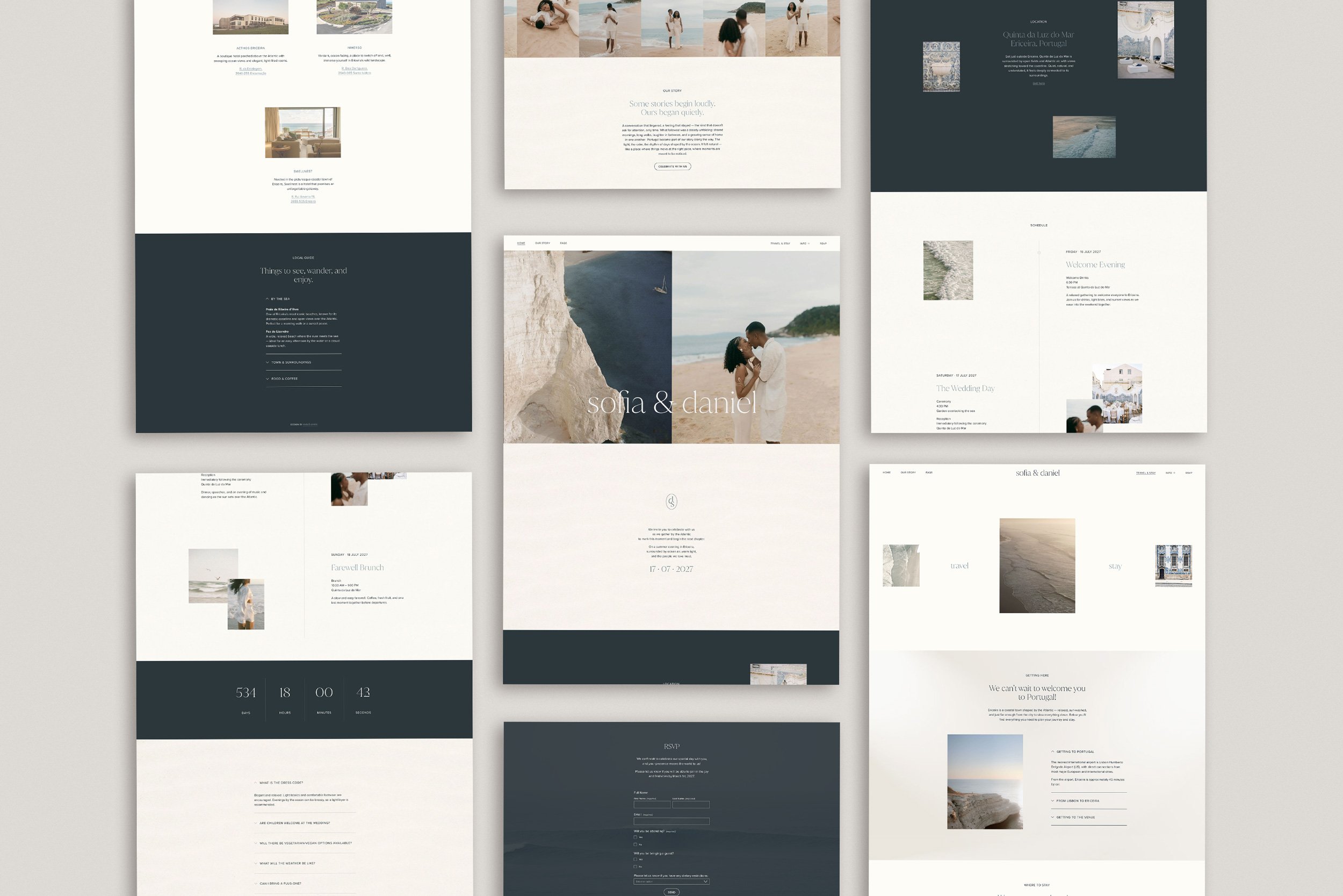 Designed with intention and restraint, Onda features minimal, airy layouts that prioritise space, rhythm, and flow. Soft movement and subtle transitions guide the experience, creating a sense of calm continuity as content unfolds. Textured backgrounds add depth without heaviness, while the contrast of pearl tones and muted blues echoes ocean light and coastal air. Every detail is considered, from generous spacing to balanced composition, resulting in a wedding website that feels modern, atmospheric, and effortlessly elegant.